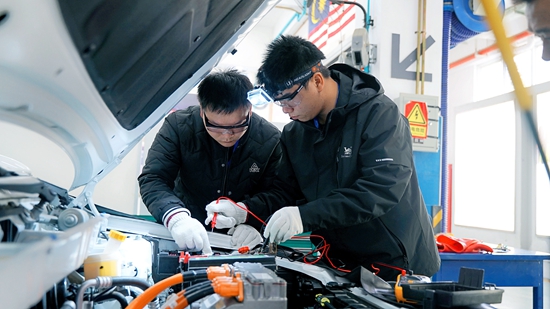 2023中国-东盟教育交流周第二届Skill Panda(成都)国际技能大赛近日在成都工贸职业技术学院开幕。来自国内多省职业院校的40多支队伍报名参赛,马来西亚和印度尼西亚两国职业院校的20余支队伍线上参赛。图为参加新能源汽车技术赛项的选手在进行操作展示。冯云波/摄