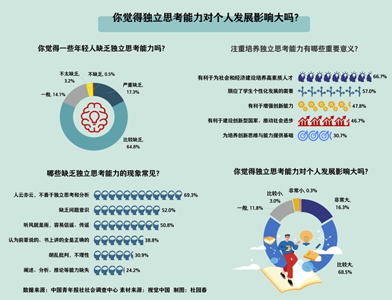 调查中,82.1%的受访者感到当下一些年轻人缺乏独立思考能力。