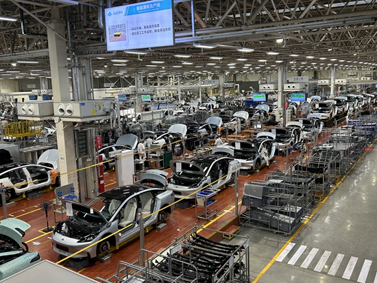 今年1-10月,我国新能源汽车出口99.5万辆,同比增长99.1%。出口猛增意味着,我国新能源汽车产业形成了较为完整的产业链,同时在智能化技术创新方面取得先发优势。图为广汽埃安工厂流水线。