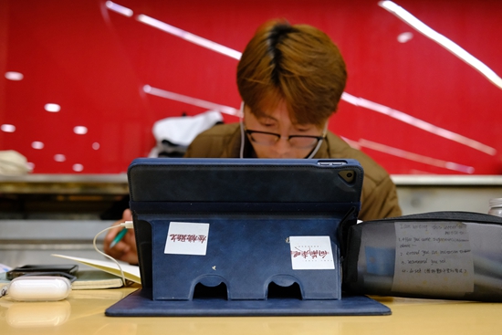 11月28日晚,云南昆明,云南师范大学呈贡校区,一名考研学生在图书馆里复习,平板电脑上贴着写有“向前走吧”“金榜题名”字样的便签。陈东/摄