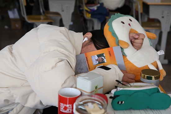 11月24日中午,安徽安庆,安庆师范大学龙山校区,一名学生趴在考研自习室的桌位上午休,用考研名师肖秀荣的书盖住脸遮光。陈东/摄