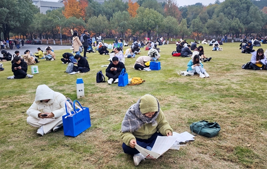 11月26日,湖北武汉,国考武汉文华学院考点,许多考生抓紧午休时间在草坪上就地复习。视觉中国供图