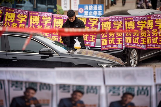 11月26日,安徽合肥,国考合肥市第三十中学考点外挂着各种面试培训宣传广告。视觉中国供图