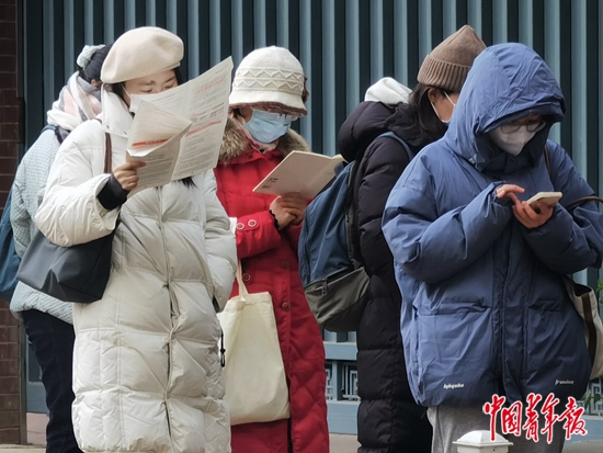11月26日上午8点10分,国考北京市第五十五中学考点,考生排队等待进入考场。当日,2024年度国考公共科目笔试正式开考,本次国考报名人数首次突破300万,参加考试人数与录用计划数之比约为57:1。中青报·中青网记者 先藕洁/摄
