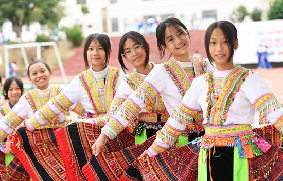 12月4日,学生在贵州省罗甸县第二小学学跳苗族芦笙舞。