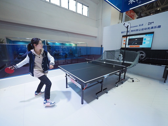 12月2日,北京国际展览中心(顺义馆),观众在链博会上体验自动发球机器人。视觉中国供图
