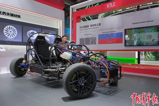 11月29日,北京,中国国际展览中心,在首届链博会智能汽车链展区,一名工作人员正在展示四轮独立驱动、独立转向汽车平台。