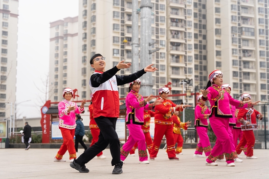 12月5日,志愿者在贵州省铜仁市万山区丹都街道旺家社区文化广场教群众跳广场舞。当日是国际志愿者日,各地开展志愿服务活动,奉献爱心,弘扬志愿精神。彭俊/摄(新华社发)