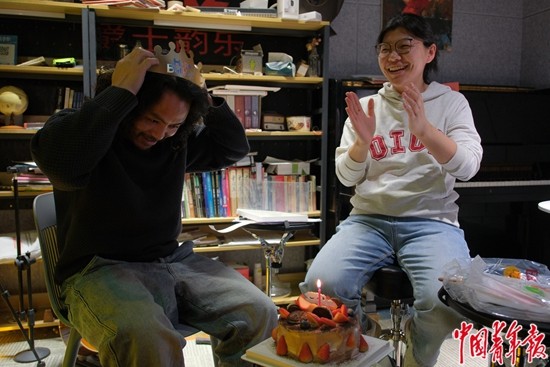 12月4日,北京市朝阳区望京的一处写字楼里,夜校老师、乐队鼓手老万(左)戴上生日帽。当天是他的生日,夜校架子鼓课程结束后,学员们一起为他庆祝。