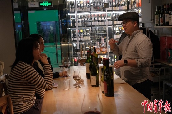 12月5日,北京市朝阳区一家酒吧内,品酒师王晔(右)在夜校葡萄酒品鉴课程结束后继续与学员们交流。
