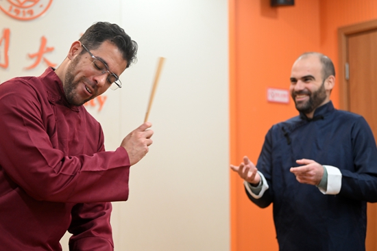 这对搭档中负责逗哏的是来自委内瑞拉的吴瑞龙,捧哏的是西班牙人墨麒麟,都是学院西班牙语系的外籍教师。他们能成为搭档用西班牙语说相声,要归功于国家级大学生创新创业训练计划——“面向西班牙语世界的天津相声文化推广项目”。承担该项目的西语系学生团队负责台本写作、视频传播等幕后工作,他俩则要做好台前演绎,合作将中式幽默转化为西班牙语境下的习惯表达。新华社记者 李然/摄