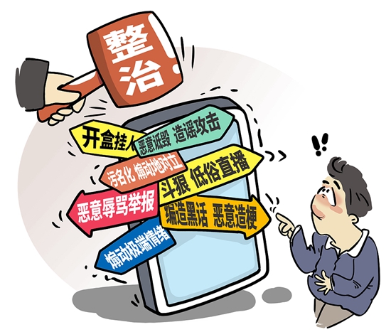 中央网信办在全国范围内启动的“清朗·网络戾气整治”专项行动,围绕社交、短视频、直播等重点平台类型,集中整治“网络厕所”“开盒挂人”行为;借社会热点事件恶意诋毁、造谣攻击;污名化特定群体、煽动地域对立;斗狠PK等低俗不良直播行为;有组织地恶意辱骂举报他人;编造网络黑话、恶意造梗等行为。