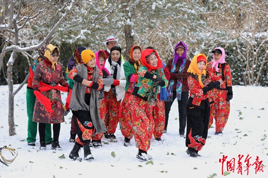 12月11日,北京市龙潭湖公园,盛装打扮的游人在雪中舞蹈。自12月10日夜间开始,北京全市各地迎来2023年冬季第一场雪。中青报·中青网记者 李建泉/摄