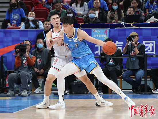 12月9日,CBA焦点战,广东男篮球员张文逸(左)在比赛中防守北京男篮球员曾凡博。中青报·中青网见习记者 罗征/摄