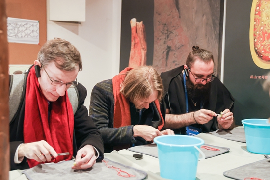 12月2日,浙江省杭州市良渚古城遗址公园,外国青年汉学家在体验琢玉项目。均由“良渚论坛”主办方供图