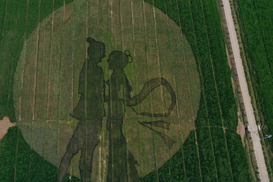 8月25日,山东省日照市莒县龙山镇一处稻田内,航拍的“牛郎织女”图案。视觉中国供图