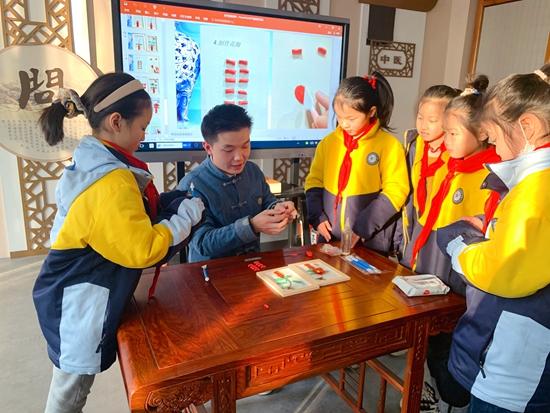 梁岗子(左二)向青少年科普非遗面塑技艺。团亳州市委供图