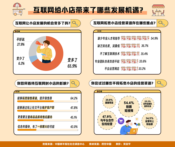 互联网对实体小店会产生哪些影响?调查显示,64.2%的受访小店店主觉得互联网能拓宽小店销售渠道,提升销售额,47.8%的受访小店店主认为能通过线上社交平台维护客户群,45.1%的受访小店店主认为更需要注重商品品质和售后服务,42.0%的受访小店店主觉得信息传播快,有了一夜爆火的可能。