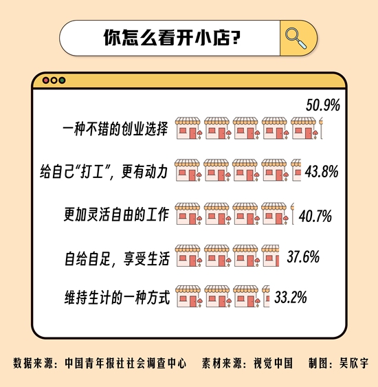 “23岁开家梦想小店”“95后裸辞创业开小店”……如今,在社交媒体平台上,许多青年创业者分享开店的经历。开一家属于自己的小店是一种怎样的体验?中国青年报社调研组对全国60多个城市226名小店店主进行的问卷调查显示,50.9%的受访小店店主觉得开小店是一种不错的创业选择,50.0%的受访小店店主觉得开小店满足了个人兴趣爱好。与此同时,中国青年报社社会调查中心联合问卷网(wenjuan.com),对1666名受访者进行的一项调查发现,超八成(84.3%)受访者喜欢逛小店。