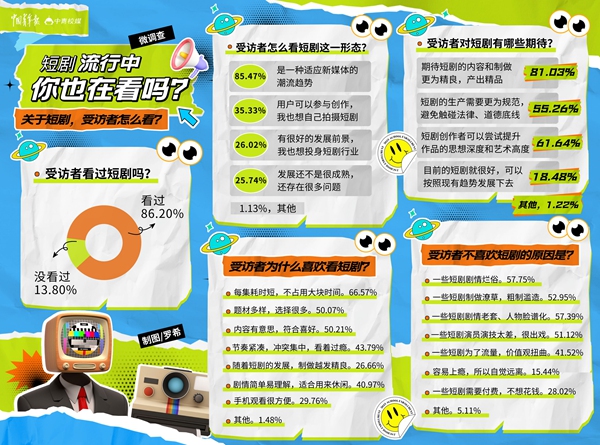 中青校媒调查显示,81.03%受访者期待短剧的内容和制作更为精良、产出精品,61.64%受访者期待短剧创作者尝试提升作品的思想深度和艺术高度。