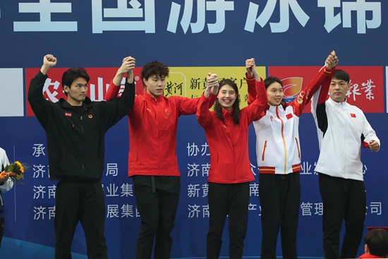 12月13日,2023全国游泳锦标赛男女4X100米混合泳接力决赛,沪苏浙鲁队夺冠。左一至右二为:徐嘉余、覃海洋、张雨霏、杨浚瑄。视觉中国供图