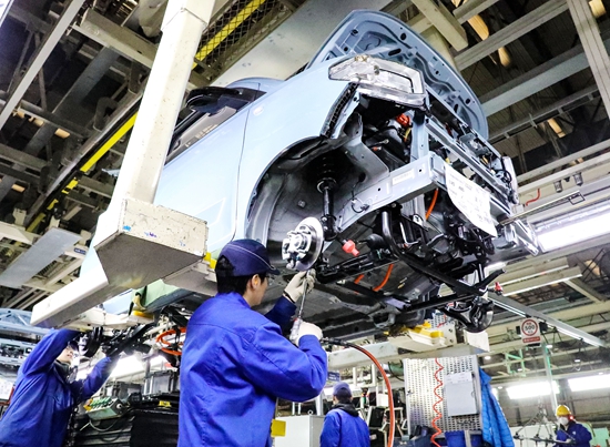 12月14日,在位于山东自贸试验区青岛片区的上汽通用五菱青岛分公司的生产车间,工人在赶制新能源汽车订单。视觉中国供图