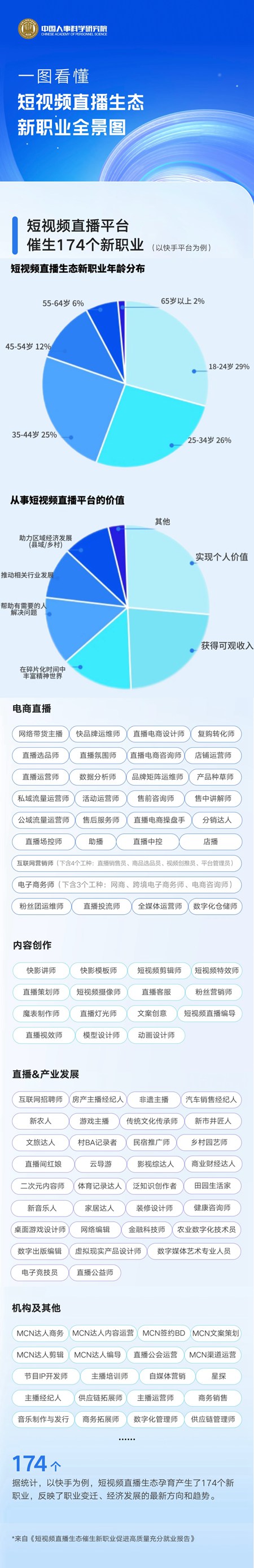 中国人事科学研究院近期发布的《短视频直播生态催生新职业促进高质量充分就业报告》显示,一块屏幕背后发生了诸多变化:中青年成短视频直播生态新职业的主力军。其中,18-24岁占29%,25-34岁占26%,35-44岁占25%。18-34岁占比达到55%。《中华人民共和国职业分类大典(2022年版)》的1639个职业中,短视频平台快手覆盖八成以上的数字职业,为劳动者提供了更广阔的职业发展空间。