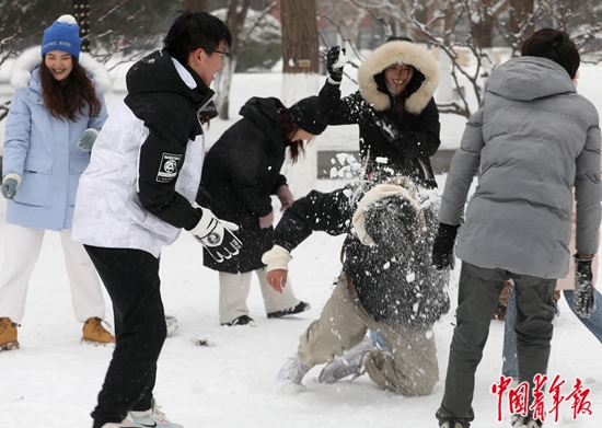 12月13日,北京交通大学,学生们在雪地里打雪仗。中青报·中青网记者 陈剑/摄