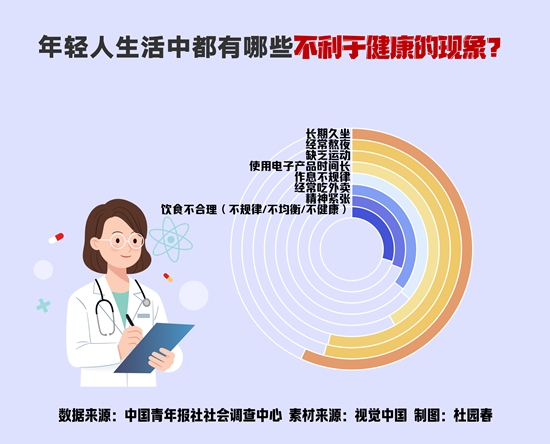 年轻人生活中普遍存在哪些不利于健康的现象?调查显示,长期久坐(56.9%)位列第一,经常熬夜(54.1%)、缺乏运动(53.9%)分别位列第二、第三。其他主要还有:使用电子产品时间长(41.8%),作息不规律(36.3%),经常吃外卖(35.5%),精神紧张(30.9%),饮食不合理(不规律/不均衡/不健康)(29.7%),不喜社交、宅(23.3%)等。
