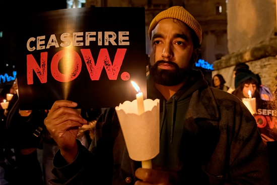12月18日,意大利罗马,一位男子手持蜡烛参加巴勒斯坦和平示威活动,呼吁巴勒斯坦被占领土和以色列永久“停火”。视觉中国供图