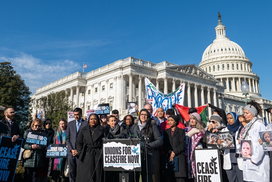 12月14日,美国华盛顿,美国唯一的巴勒斯坦裔国会议员拉希达·特莱布(前排中讲话的女士)在国会大厦前呼吁加沙停火。视觉中国供图