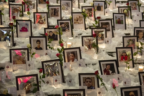 11月29日,瑞典斯德哥尔摩,在市中心举行纪念国际声援巴勒斯坦人民日的集会后,在以色列对加沙袭击中丧生的巴勒斯坦儿童的照片被烛光照亮。视觉中国供图