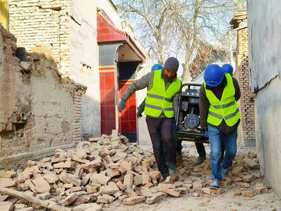 中国铁塔甘肃省分公司工作人员在积石山县刘集乡团结村抬发电机。受访者供图