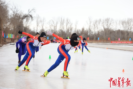 12月20日,新疆生产建设兵团第十师一八一团中学学生在进行速度滑冰训练。新疆生产建设兵团第十师北屯市地处北纬“黄金雪域线”,丰富的冰雪资源催生了冰雪运动、冰雪产业、冰雪旅游的健康快速发展。当地中小学校也将冰雪运动纳入体育竞技课程,进行教学、训练、推广。2023年,第十师一八一团中学由国家教育部审批挂牌成立“全国青少年校园冰雪运动特色学校”,校园里开展速度滑冰、传统越野式滑雪、雪地足球等丰富多彩的冰雪运动。中青报·中青网记者 谢洋/摄