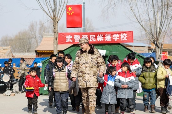 12月23日,甘肃临夏,在积石山县刘集乡高李村临时安置点“武警爱民帐篷学校”,武警甘肃总队临夏支队官兵领着孩子放学。视觉中国供图