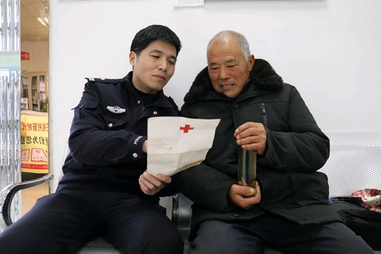 12月18日,在舒城县三松村,张中德(右)向青年民警张祥介绍中国红十字会寄给他的感谢信。王可海/摄