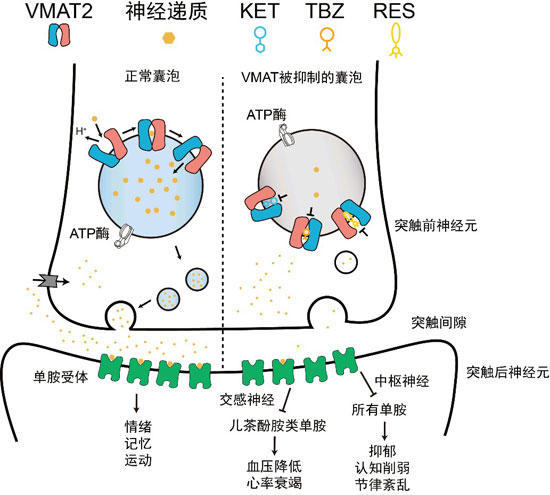 VMAT2是大脑中最重要的囊泡单胺转运蛋白,负责将5-羟色胺、多巴胺、肾上腺素、去甲肾上腺素和组胺等神经递质转运到囊泡中储存,以便受到外界刺激后释放单胺神经递质。