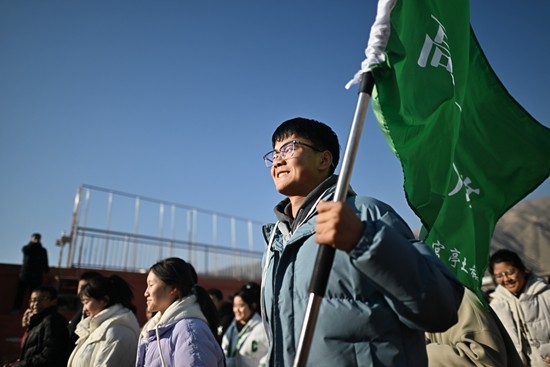 12月25日,来自民和县官亭镇土族中学的学生马忠林(前右)和同学们在民和县城西高级中学的操场上跑操。积石山6.2级地震发生后,青海省海东市民和回族土族自治县、化隆回族自治县、循化撒拉族自治县共有371所中小学近12.6万名学生停课。海东市教育部门采取线上与线下、异地分流与就地安置相结合的方式尽快恢复受灾地区正常教育教学秩序。截至目前,海东市受灾地区线下复课学校为355所,线上复课学校16所,中小学线上线下复课率达100%。新华社记者 张宏祥/摄