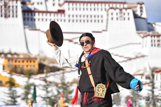 12月24日,拉萨,模特展示藏族传统服饰。当日,“以服饰文脉,讲西藏故事”——首届“拉萨服饰周”活动在西藏自治区拉萨市举行。以布达拉宫广场为舞台,模特向观众们展示了60余套传统藏民族服饰。中新社记者 贡嘎来松/摄