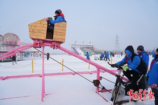 12月19日,新疆生产建设兵团第十二师青少年冬令营活动现场,来自五一农场学校的学生正在玩有趣的雪地游戏。中青报·中青网记者 王雪迎/摄