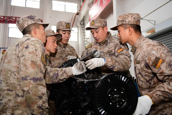 火箭军某部二级军士长张飞(右二)二十年如一日专攻精练装备维修技能,带出一批“战车神医”。闵定磊/摄