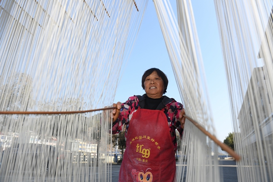 1月4日,在桑洲镇桑洲村,村民季月芽在自家门前晾晒垂面。冬季,浙江省宁海县桑洲镇进入垂面制作高峰期。垂面是流行于浙江宁波、台州的特色面食,因垂直悬挂制作而得名。新华社记者 翁忻旸/摄