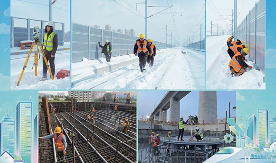 青年工程人员进行高铁桥梁上承台底层预应力管道安装、转体施工桥梁下球铰安装、日常巡护等操作。受访者供图