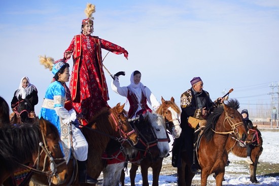 新疆伊犁,哈萨克族婚礼上,新娘在马背上跳舞。曹钰琛/摄