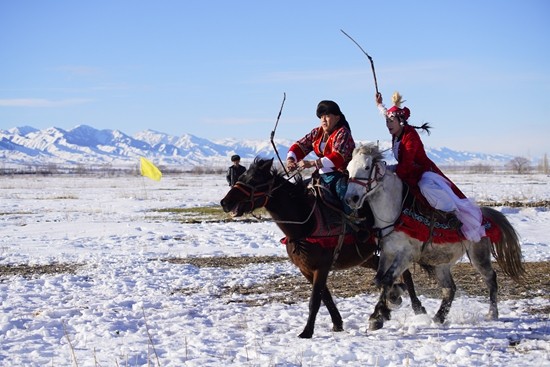“姑娘追”:新疆伊犁,一对哈萨克族新婚夫妇在婚礼上举行“姑娘追”活动。“姑娘追”是哈萨克族的马上体育、娱乐活动,多在婚礼、节日等喜庆之时举行。2009年4月25日,列入联合国非物质文化遗产名录。曹钰琛/摄