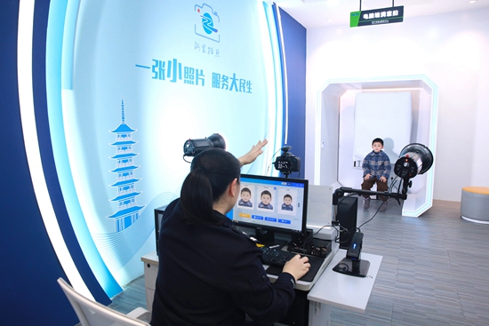 1月9日,第四个中国人民警察节前夕,浙江嘉兴,海宁市政务服务中心公安窗口工作人员正在使用“浙里拍照”电脑端为小朋友拍摄证件照。在公安机关免费拍摄的证件照,不仅在办理出入境证件、身份证、驾驶证时通用,也能共享到其他政务、公共、社会化服务应用场景,这项改革被纳入浙江省政府2023年度民生实事工程。目前,浙江省公安机关共有114家单位、1156个窗口实现“通拍通用”,累计为群众免费拍摄证件照830万余张。中青报·中青网记者 蒋雨彤/文 周正飞/摄