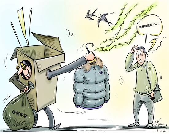 随着预售模式深入到电商产品的各个品类,预售正在成为一些消费者网购时的“噩梦”。不少衣服的预售期7天起步,15天、30天、45天、60天也都见怪不怪。有消费者因天气转冷提前下单买冬装,结果等寒潮过去了,商家还没发货。(《广州日报》1月7日)漫画:徐简