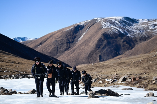 1月9日,大通回族土族自治县公安局北川河源区国家级自然保护区生态警务室民警和辅警在巡逻。