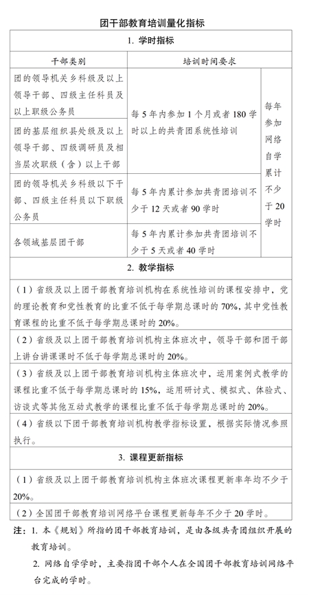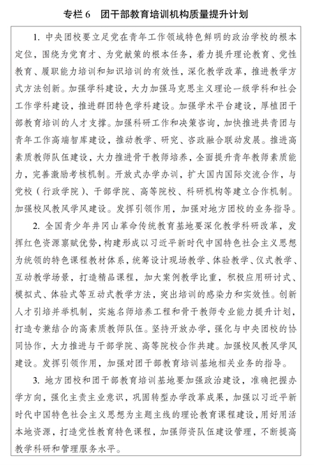 (一)培训机构建设。加强团干部教育培训机构规范管理和质量提升,推进各级团校、团干部教育培训基地建设,构建以中央团校、全国青少年井冈山革命传统教育基地为龙头,各级团校、团干部教育培训基地相互补充、布局合理、规范有序的培训机构体系,强化中央团校对地方团校的业务指导,不断提高办学水平。加强各类团干部教育培训机构规范管理,开展团干部教育培训机构办学质量评估。支持各地各级团组织联合开展培训,鼓励团干部教育培训机构开展区域协作交流,推动优质培训资源共建共享。实施团干部教育培训机构质量提升计划(专栏6)。