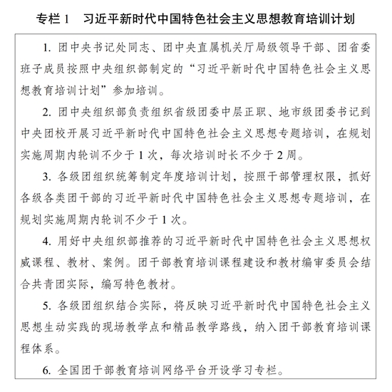 (一)聚焦聚力,久久为功。完善团干部理论教育培训长效机制,落实党的创新理论学习教育计划,组织实施习近平新时代中国特色社会主义思想教育培训计划(专栏1),系统谋划、持续用力,不断把思想铸魂、理论武装工作引向深入。坚持把习近平新时代中国特色社会主义思想作为团的各级领导机关班子成员理论学习中心组学习首要内容,作出具体安排、精心组织实施;作为各级团干部教育培训机构的主课必修课,办好理论进修班、理论研修班;作为团干部学习的中心内容,全面系统学、持续深入学、联系实际学。以县处级及以上团干部为重点,开展习近平新时代中国特色社会主义思想和党的二十大精神集中轮训;深入开展主题教育,通过专题学习、研讨交流、主题党课、调查研究、建章立制等形式,推动党的创新理论学习教育走深走实走心,使广大团干部更加深刻领悟“两个确立”的决定性意义,更加自觉增强“四个意识”、坚定“四个自信”、做到“两个维护”。深入开展习近平总书记关于青年工作的重要思想学习培训,使广大团干部学习掌握党的青年工作的地位作用、目标任务、职责使命、实践要求,为做好新时代新征程党的青年工作打牢思想基础。